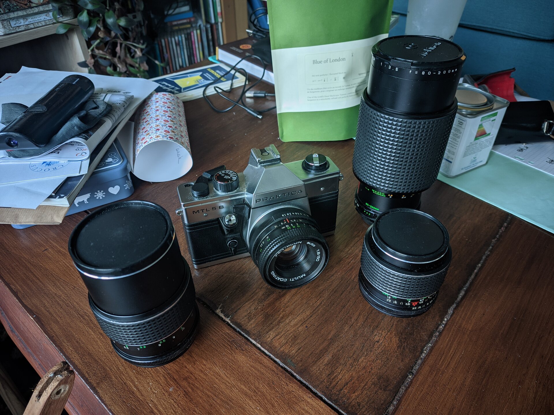 Quelques semaines plus tard, je suis en train de me balader parmi les étals des puces mensuelles à Angers (quoi ? j’ai le droit, non ?) lorsque j’apperçois dans une boîte à chaussures une collection d’objectifs confortablement posés à côté d’une copie conforme de mon appareil.