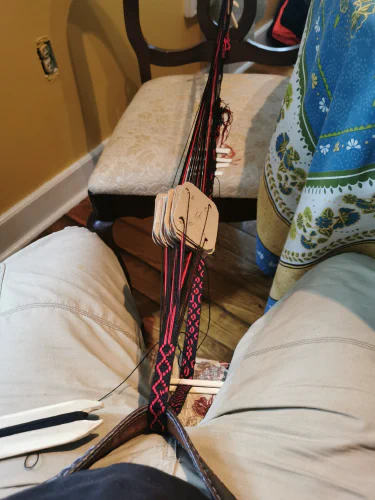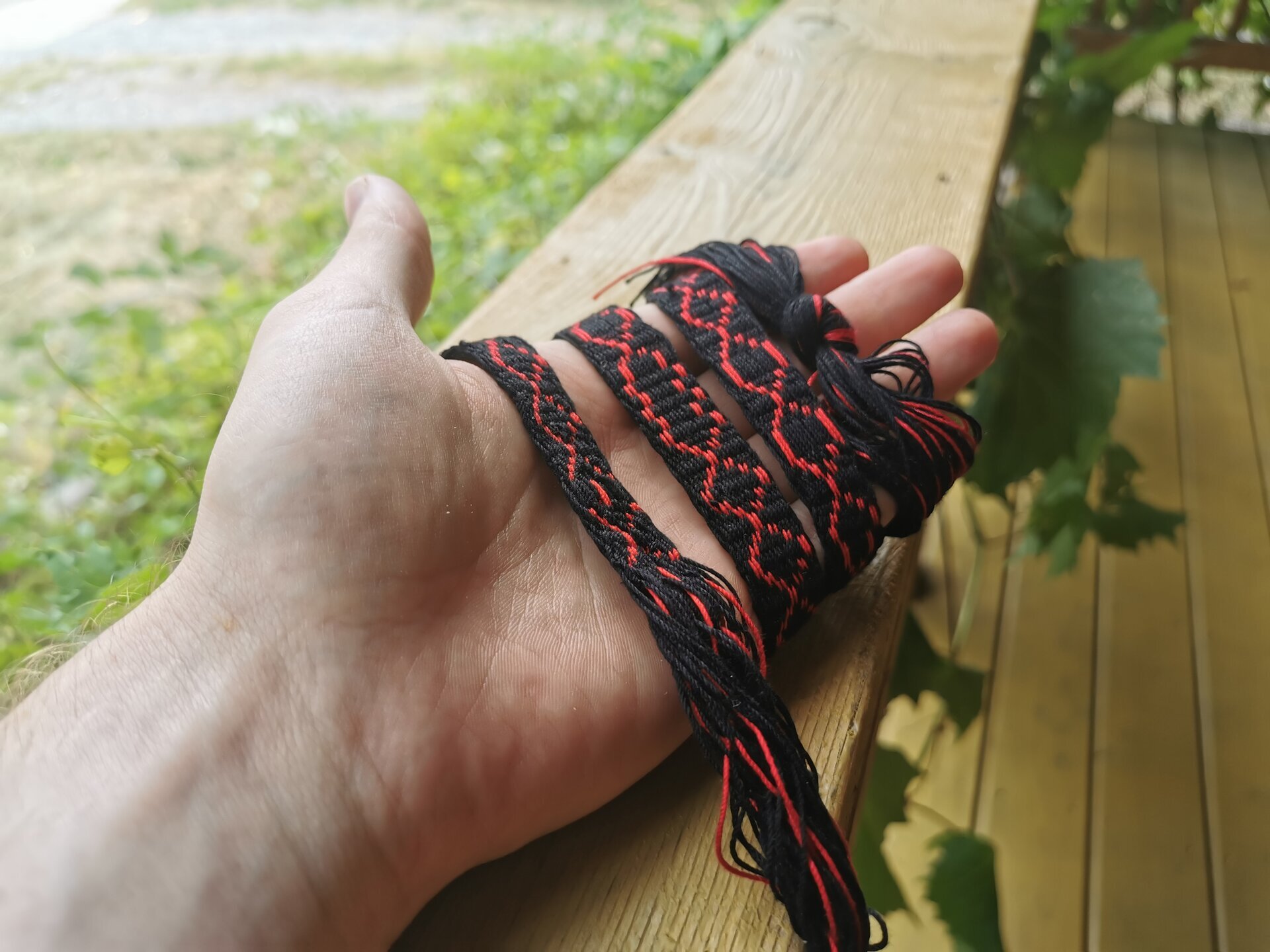 En 2022, lors de mon voyage de 2 mois au canada, je me suis motivé à faire mon premier tissage avec la méthode des cartes : j’ai créé quelques rubans tissés avec du fil acheté chez l’inévitable Walmart local et des cartes découpées dans des boîtes de céréales.
