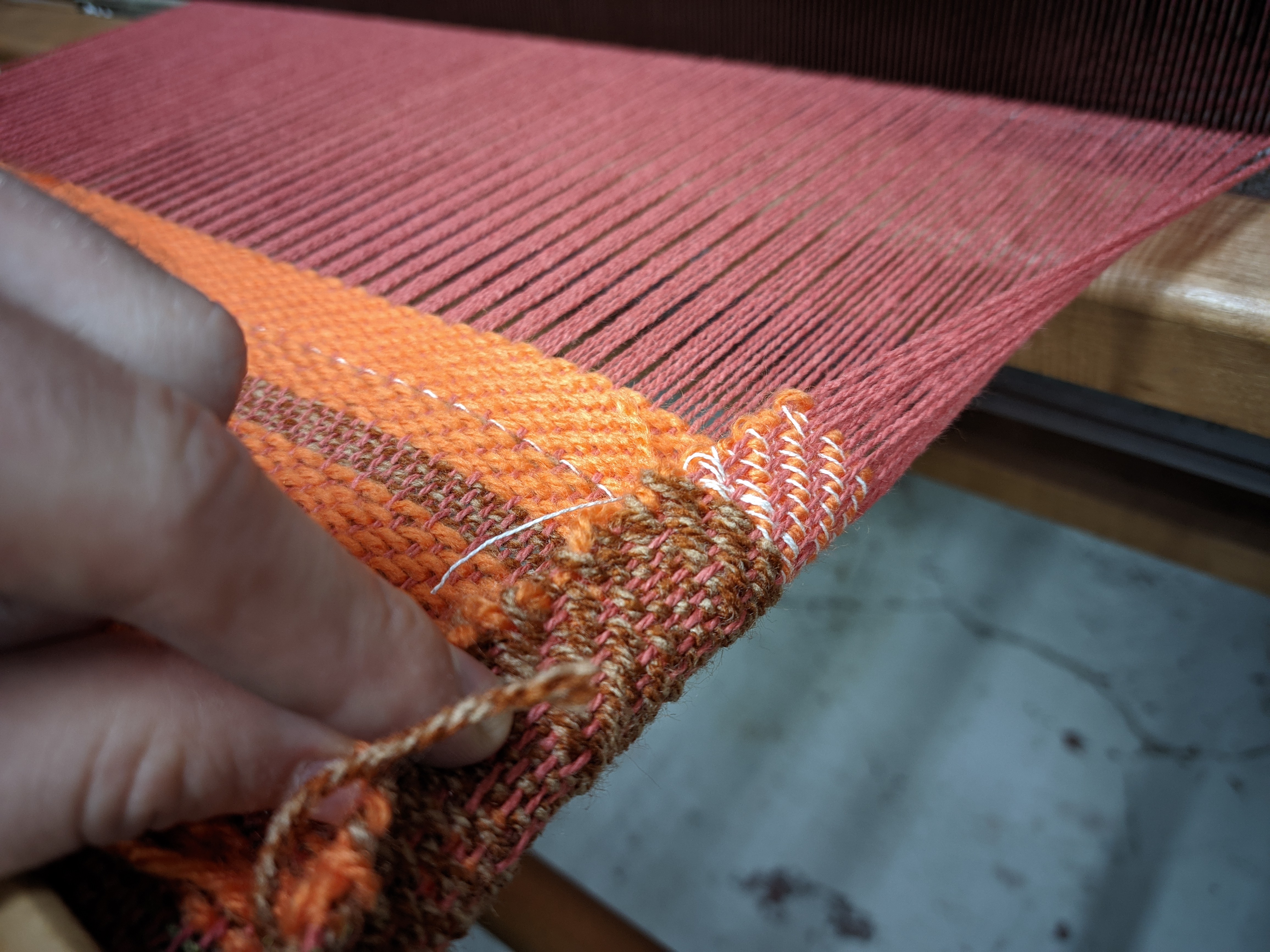 Mais le fil que je fais passer avec la navette, (le fil de trame), peut être modifié. D’ailleurs, rien ne m’empêche d’alterner entre 2 fils différents.