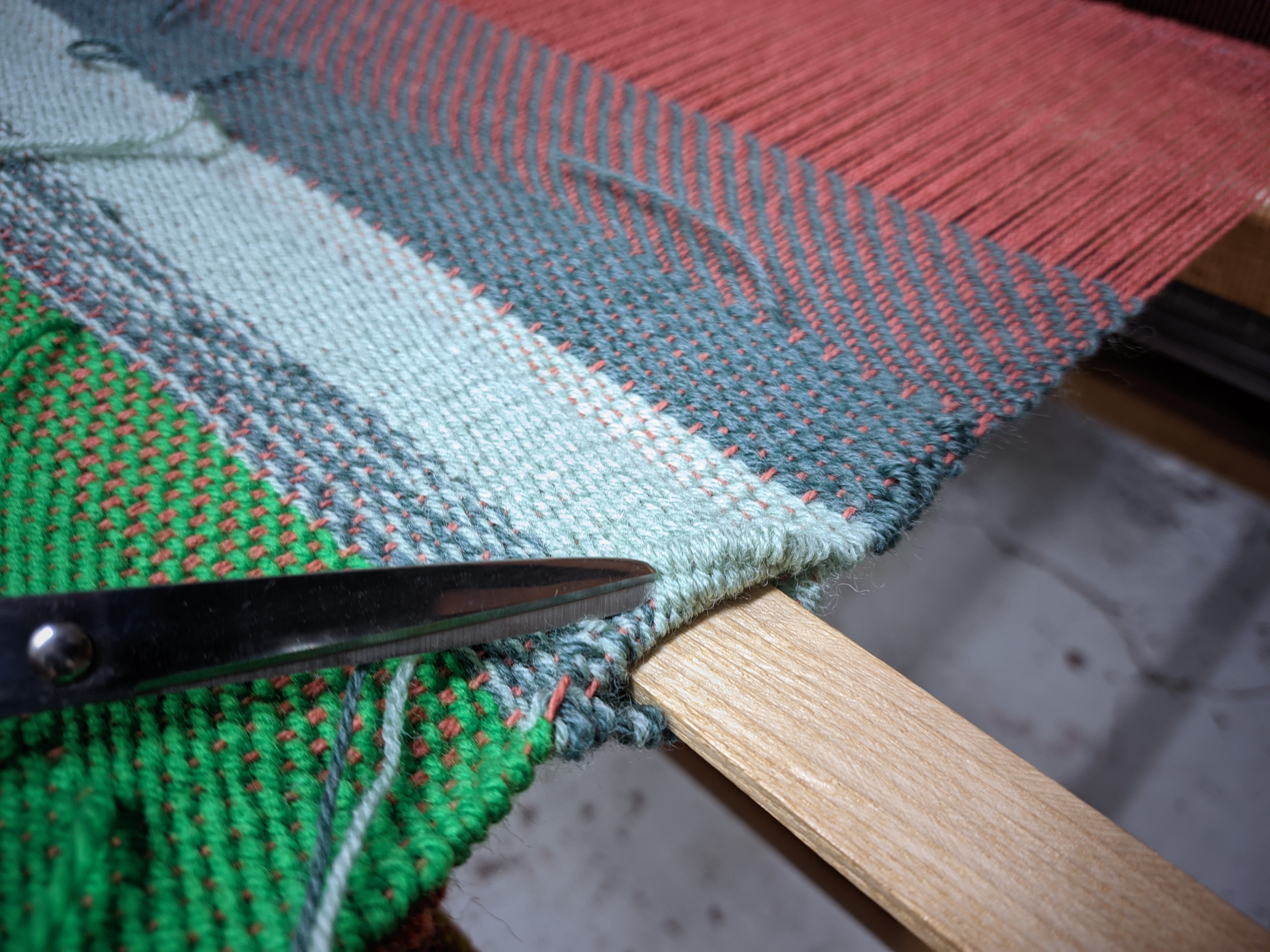 A la fin de la journée, et de la semaine de stage, c’est le moment de vérité : couper des fils de chaîne pour libérer mon tissu de son outil créateur, et révéler la création en la déroulant de son ensouple :