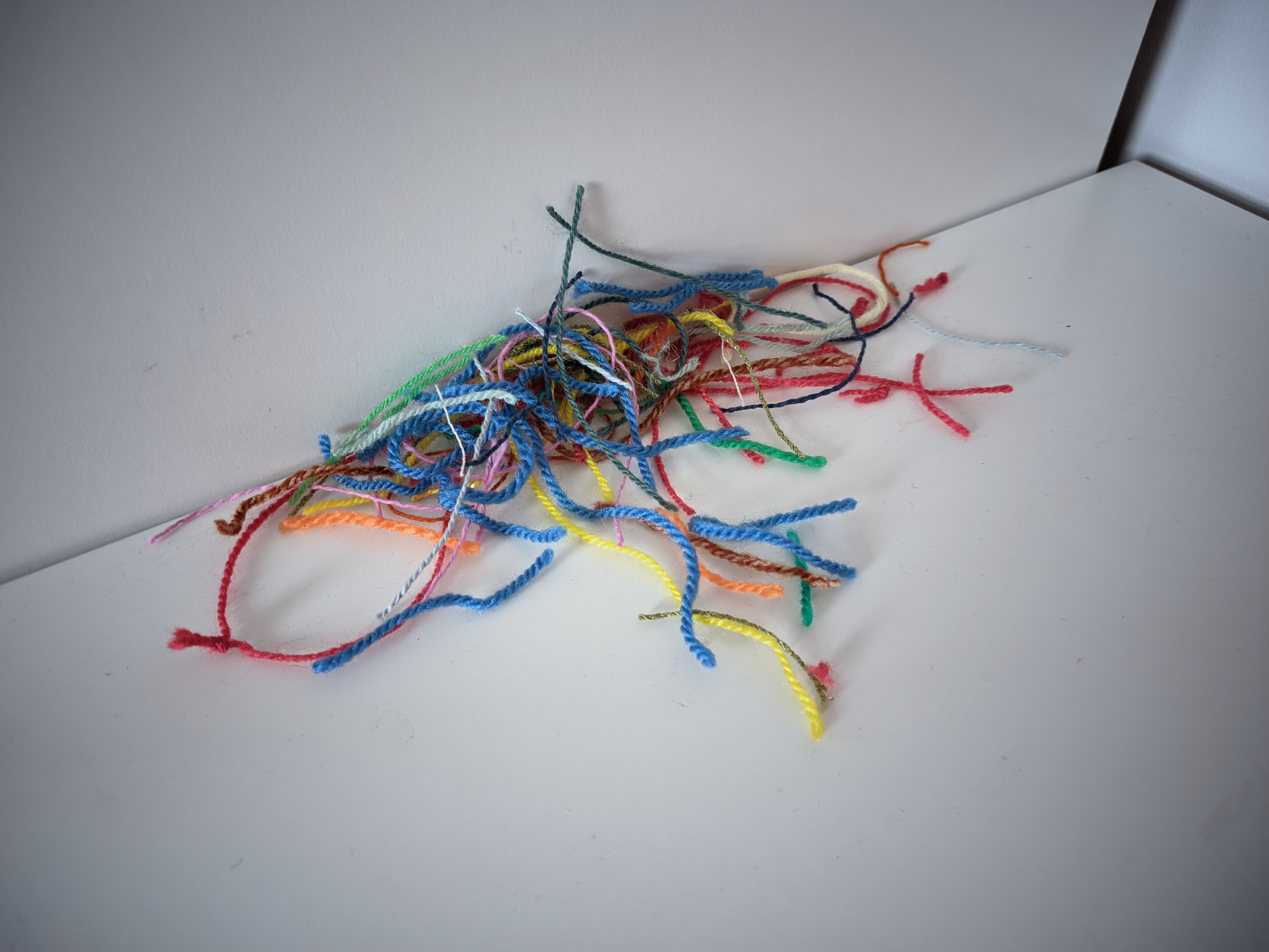 Les couleurs bariolées des fils que j’ai coupés témoignent de la variété de fils que j’ai testées cette semaine : couleurs, matières, épaisseurs différentes.