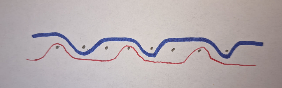 Sur cette vue en coupe, on regarde la tranche du tissu. Les points gris sont les fils de chaîne, et les traits bleu et rouge les fils de trame.