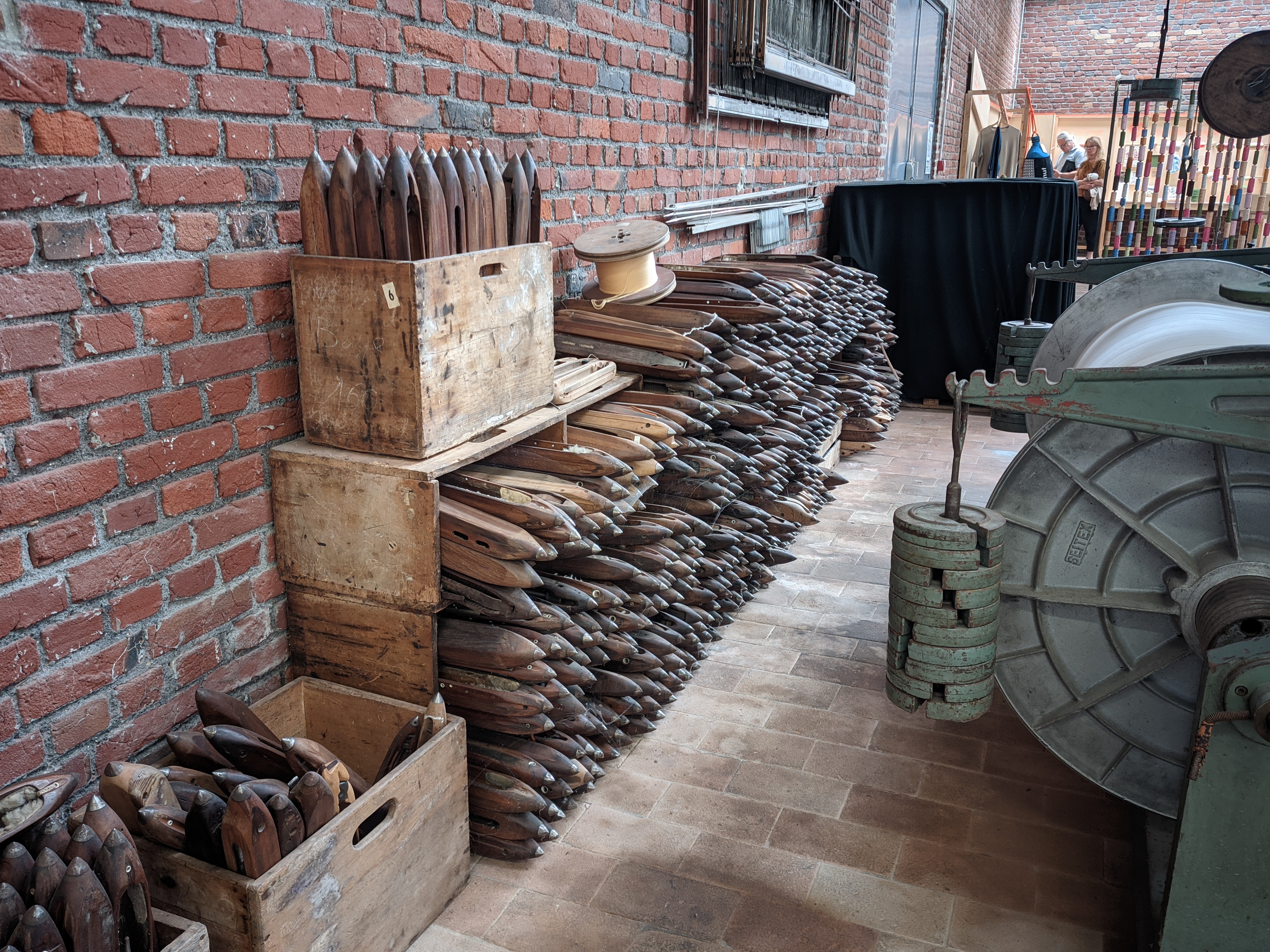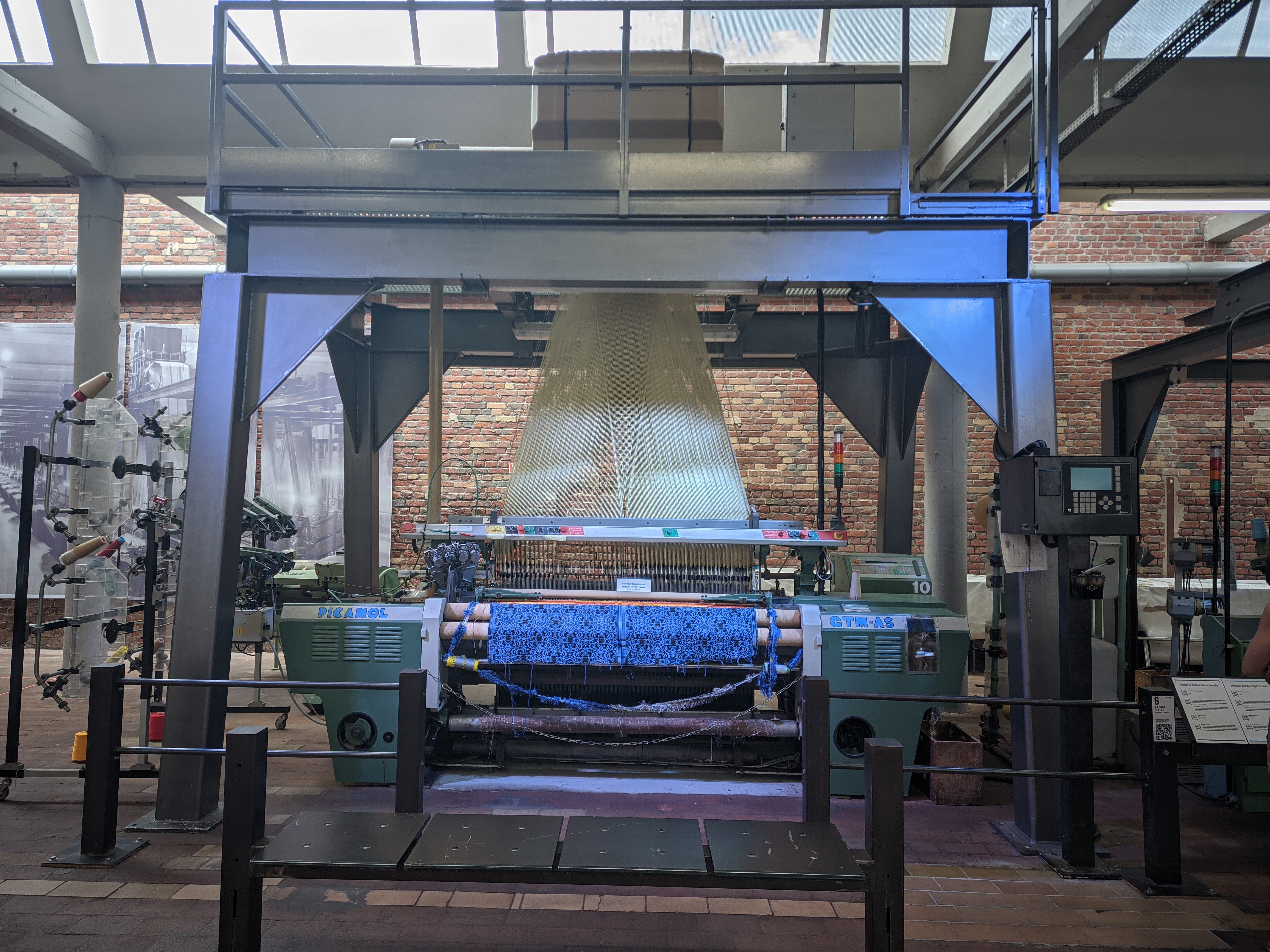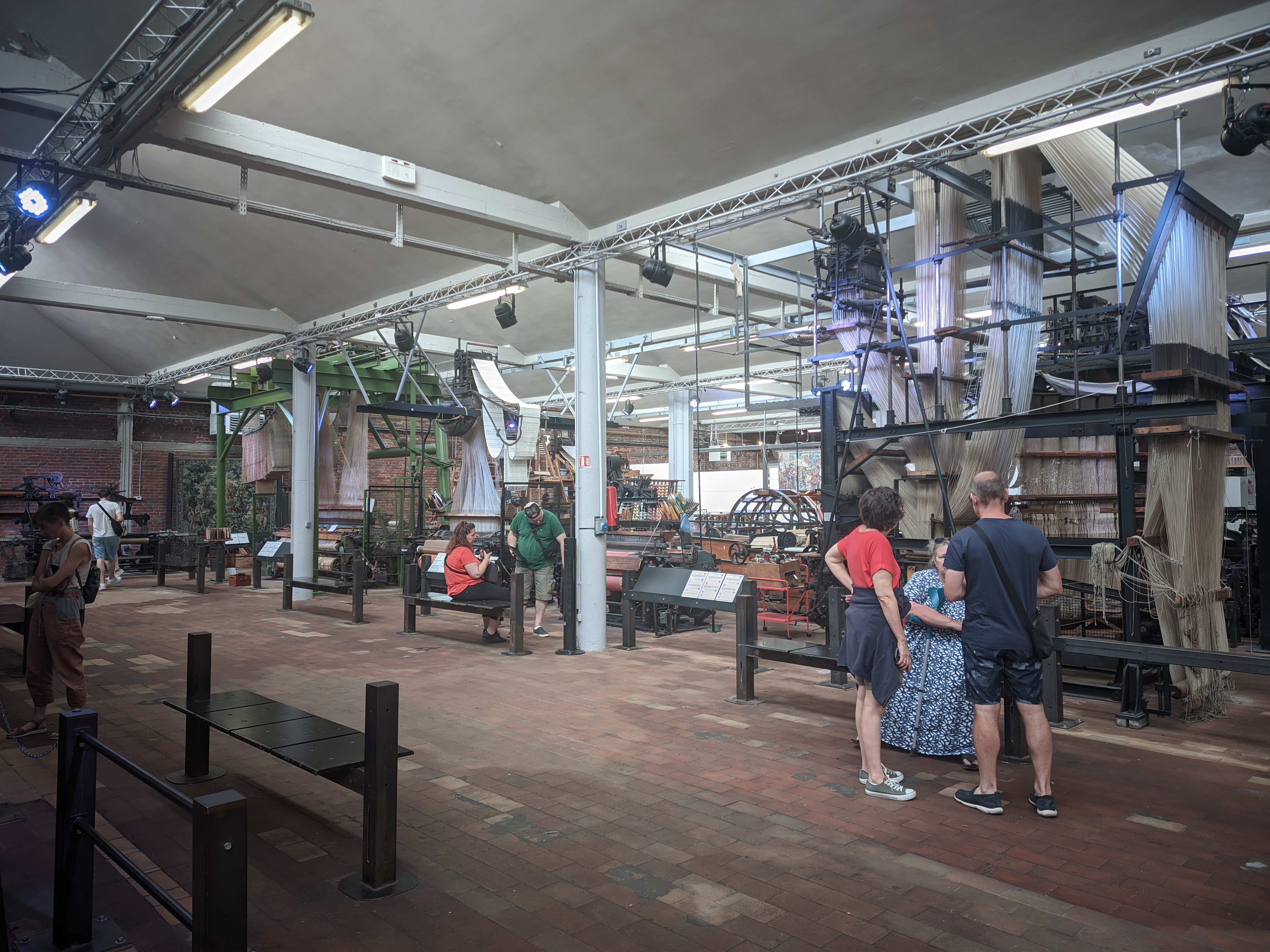 On entre dans une ancienne usine de tissage devenue musée, dans laquelle sont exposés des métiers à tisser de toutes époques, en état de fonctionnement.