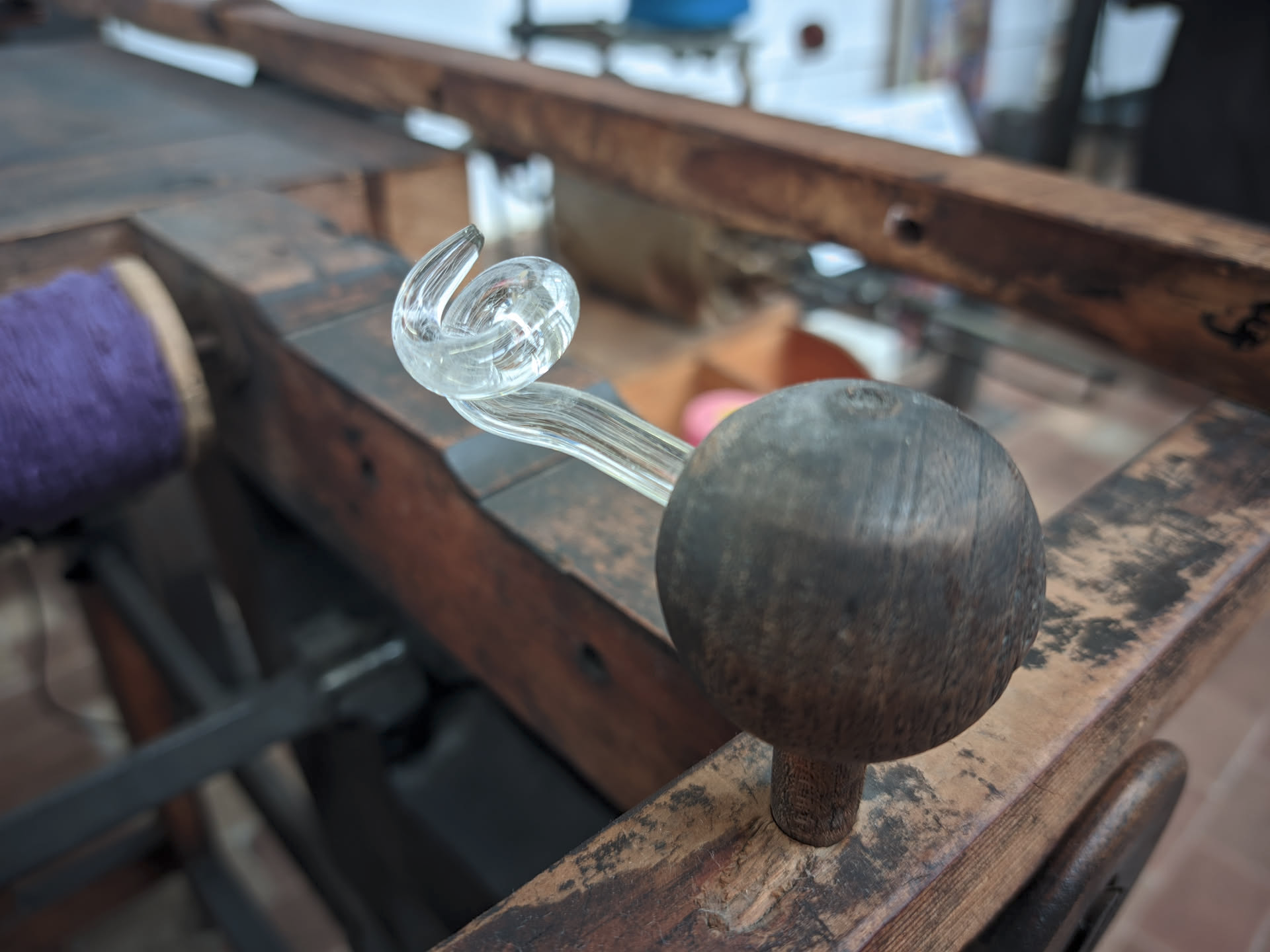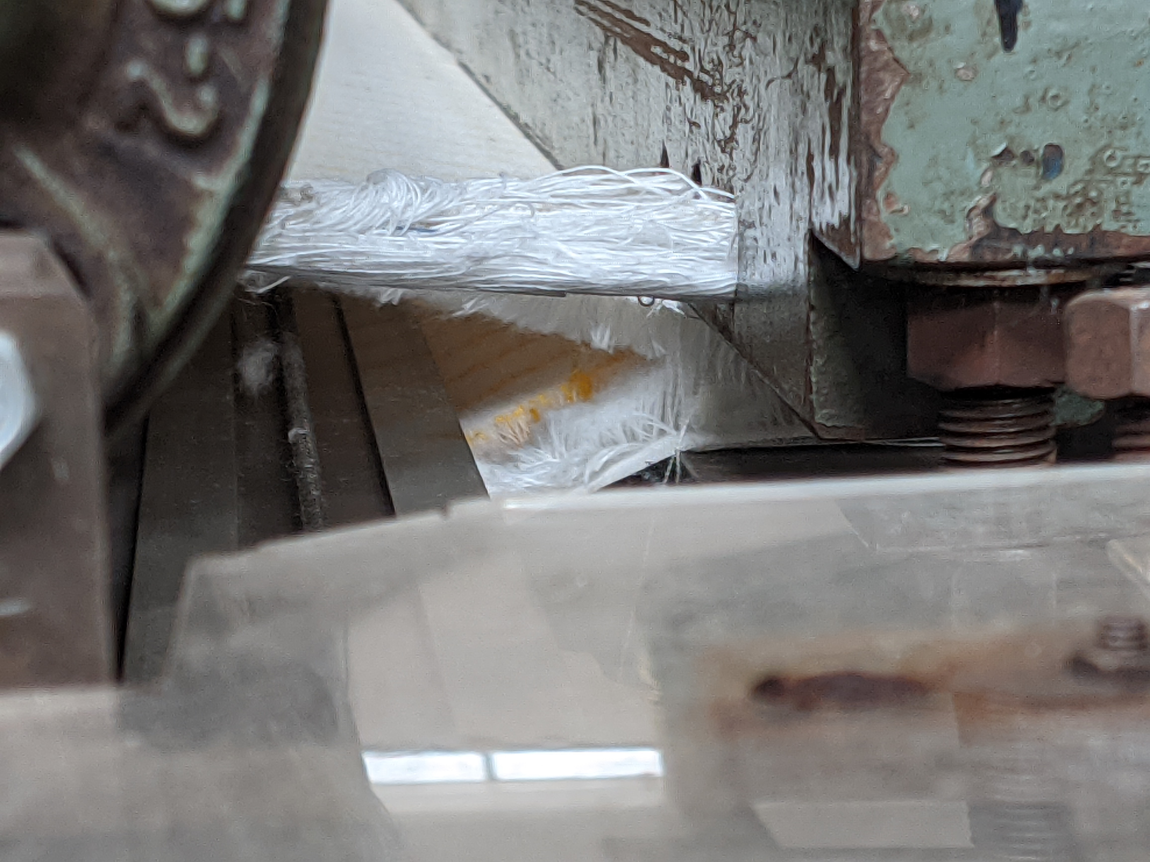 J’ai remarqué sur plusieurs machines un détail dont je n’avais pas entendu parler : pour éviter que les fils des métiers s’usent et cassent, ils cheminaient par des passages en verre !