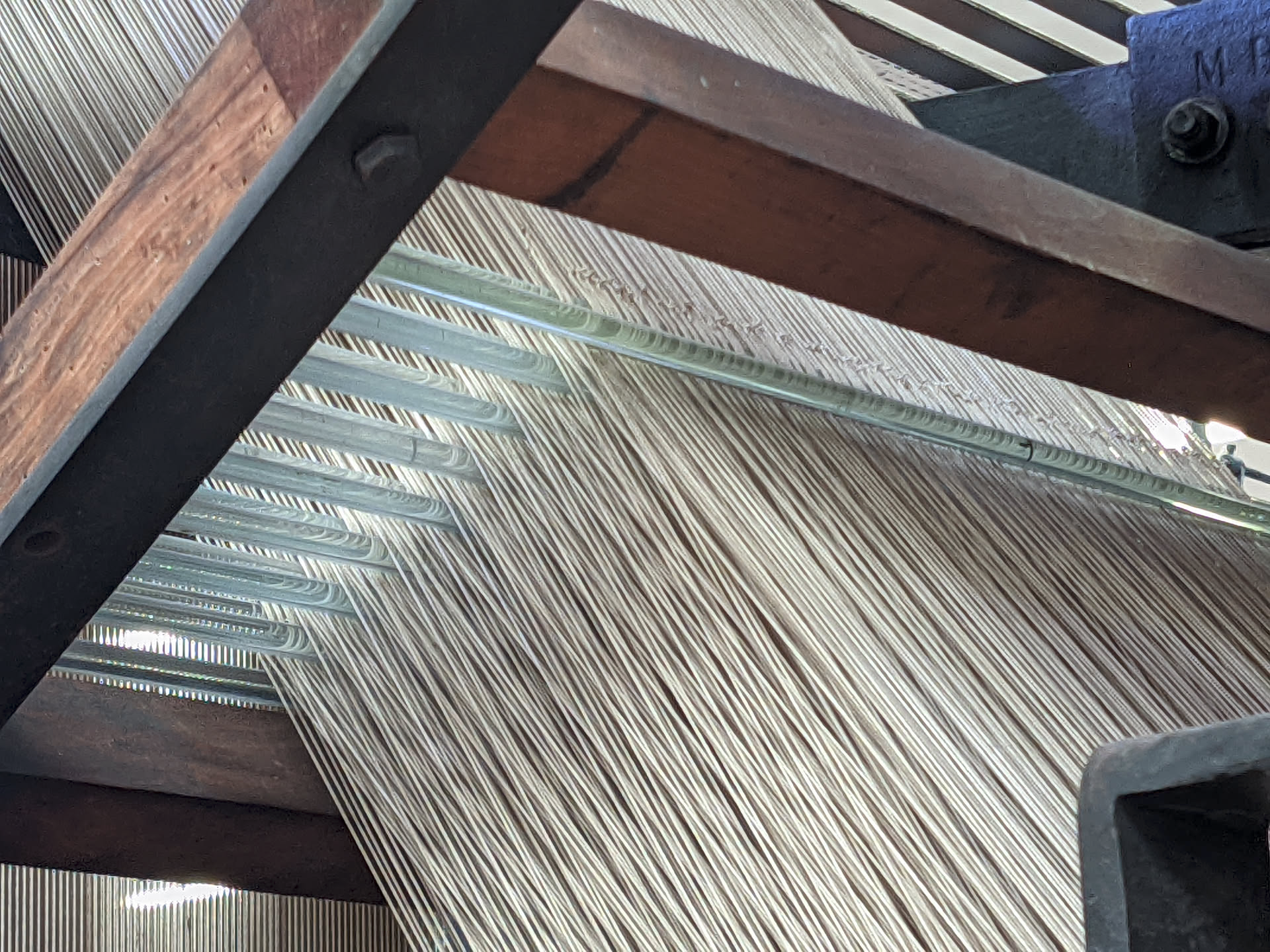 Je suis comme un enfant devant les démonstrations en live : regardez ici la navette, et les centaines de fils du mécanisme jacquard :