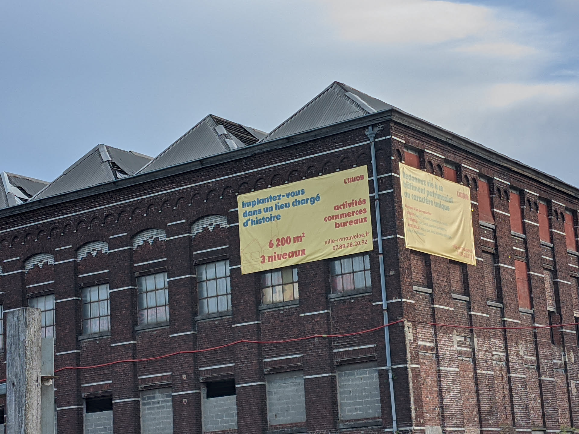 Sur le trajet de la gare, le long du canal ayant autrefois acheminé fibres et étoffes (et charbon), une annonce immobilière :